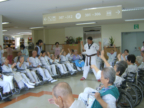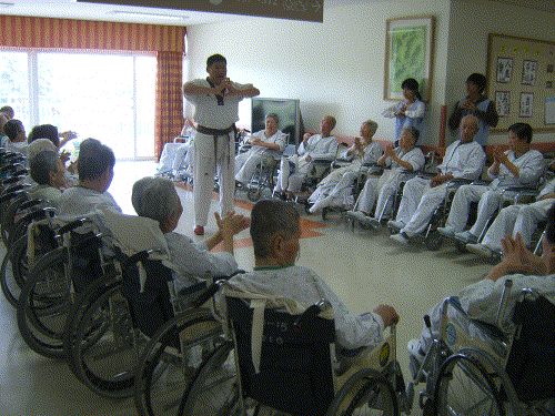 태권도 관장님이 직접 오셔서 어르신들에게 맞춰서 간단한 태권도 스트레칭을 배워보는 시간입니다.