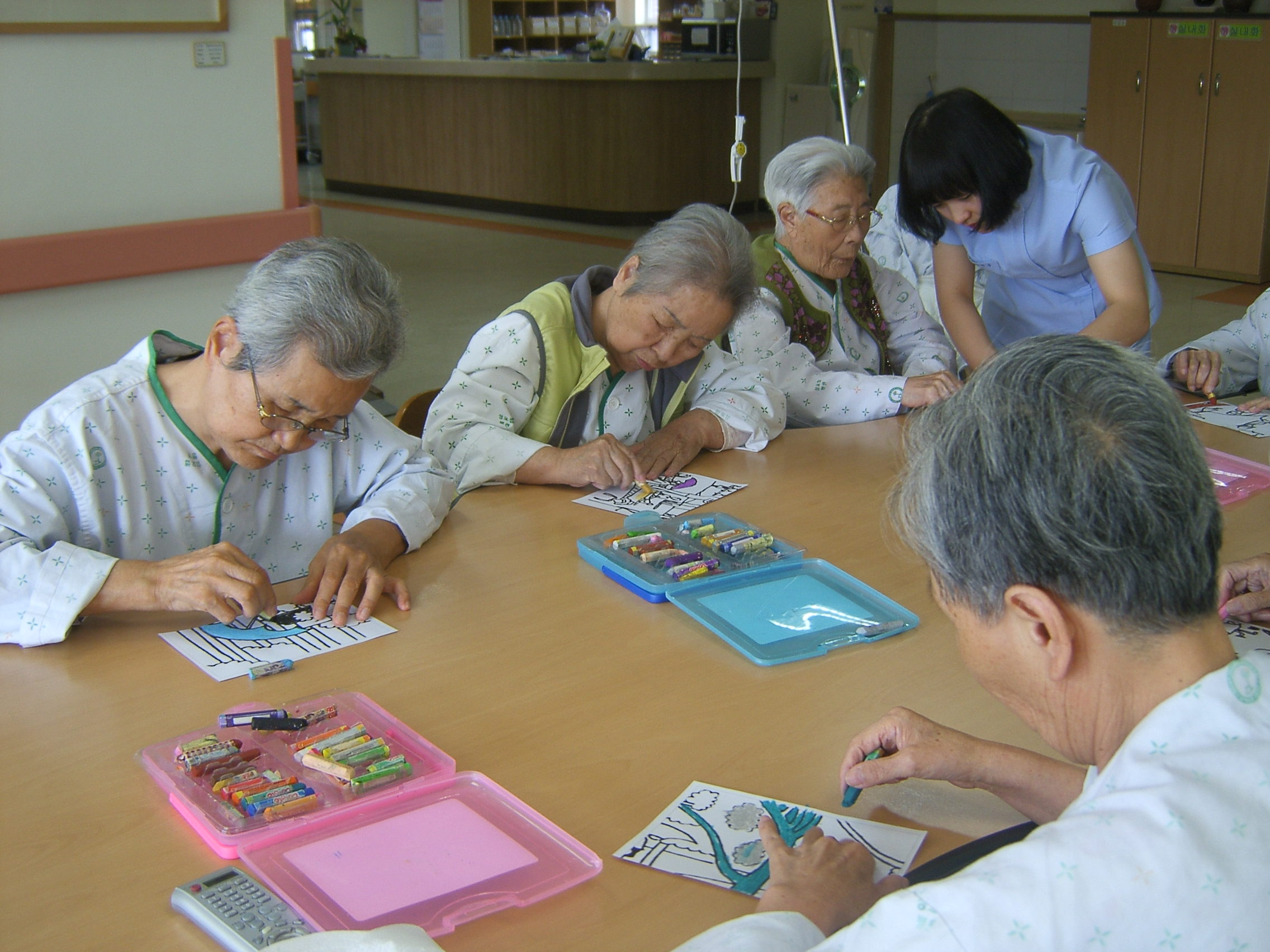 그랑드자트섬의 일요일 오후 라는 명화를 그림으로 인쇄하여 어르신들과 협동화를 그리는 미술요법시간을 갖었습니다.