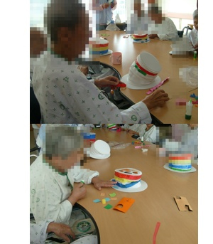미술요법 시간에 멋쟁이 모자 만드셨습니다..완성된 모자를 쓰시며 너무 멋지다며 좋아 하셨습니다.