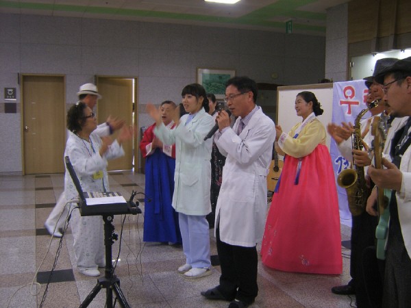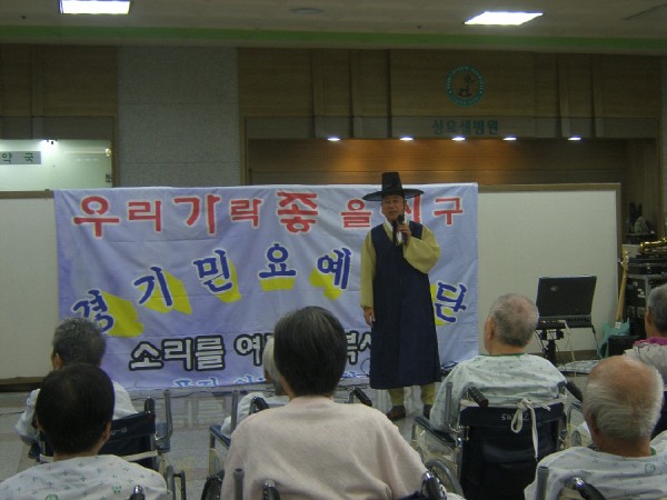 1월 22일에는 어르신들을 위해 용인에서 한걸음에 달려와 주신 경기 민요 예술단의 새해맞이 공연이 있엇습니다. 아름다운 미소와 색소폰 연주, 흥겨운 노래를 선사하셨는데, 특히나 듀엣으로 한복을 곱게 차려 입고 국악을 메들리로 선보이는 시간에는 장단에 맞춰 박수도 치시고 큰 소리로 노래를 따라 부르기도 하시며, 어르신들의 호응이 가장 뜨거웟던 시간이엇습니다. 이번 공연만큼은, 어르신들을 위해 노래불러주시고, 연주해주시는 봉사단, 그를 보고 즐겁게 박수 쳐주시는 어르신들이 모두 하나가 되었던 행복한 날이었습니다. 추운 날씨에도 불구하고 먼 길을 찾아 주신 경기민요 예술단 회원 분들께 진심으로 감사드립니다.