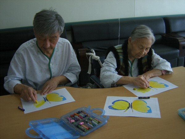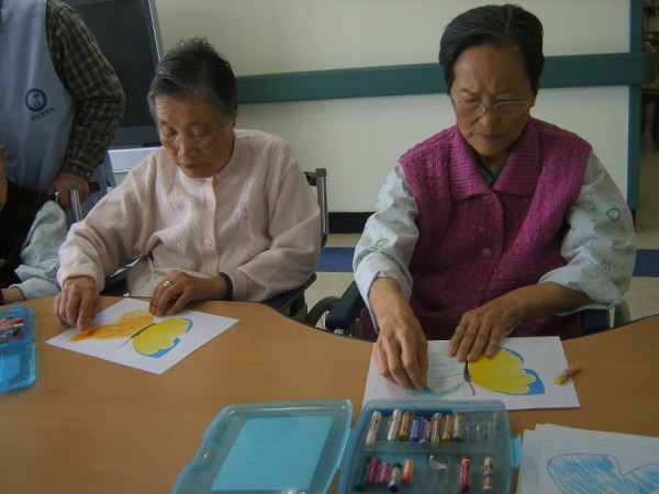 미술요법 시간에 나비 모양을 완성시키는 반쪽 그림 완성하기 프로그램을 하셨습니다.