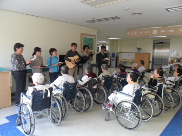 입원해 계신 기독교 신자 분들들 위해 백성교회 목사님의 예배가 있었습니다. 함께 오신 신자분들의 찬양을 들으시며 어르신들이 무척 좋아하셨습니다.